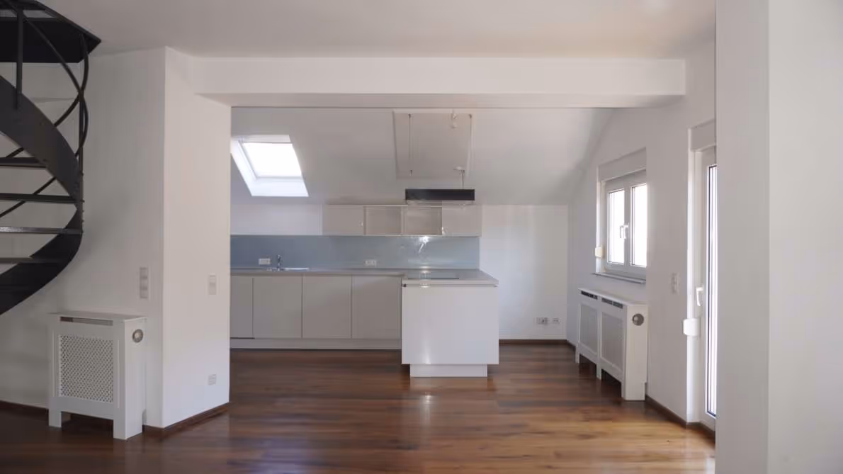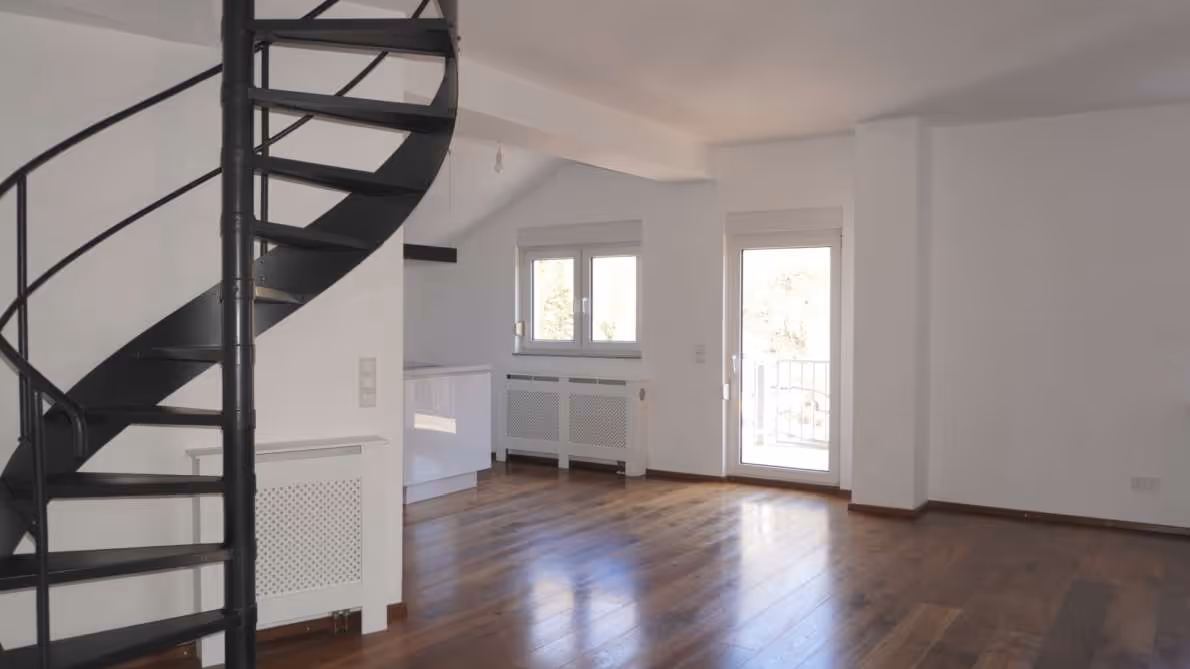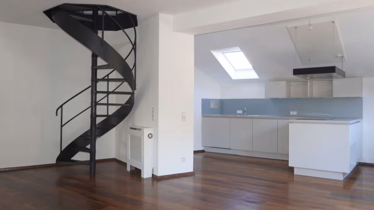 Über eine elegante Wendeltreppe erreichen Sie die zweite Ebene mit einem weiteren Schlafzimmer. Von dort führt die Treppe weiter in das Dachgeschoss – ein zusätzlicher Raum mit beeindruckendem Galeriecharakter. Dieser Bereich kann flexibel als Schlafzimmer, Arbeitszimmer oder kreativer Rückzugsort genutzt werden. Durch die offene Gestaltung entsteht ein einzigartiger Galerieblick in die darunterliegende Ebene, der dem Raum eine besondere Großzügigkeit und ein außergewöhnliches Wohngefühl verleiht.