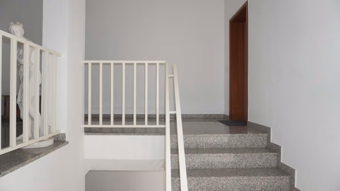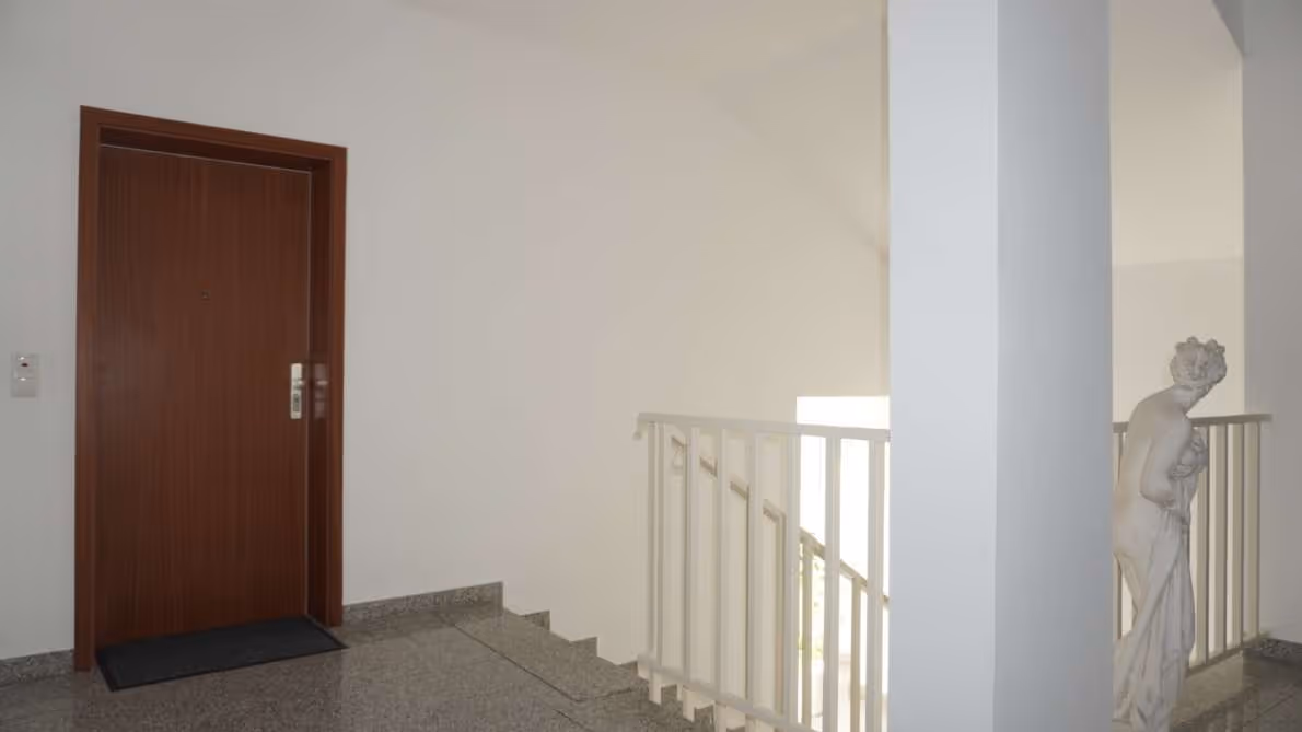 Durch die mehrstöckige Bauweise und die markante Holzverkleidung ist erkennbar, dass sich diese Wohnung über mehrere Ebenen erstreckt – ein architektonisches Detail, das sie innerhalb des Hauses hervorhebt.