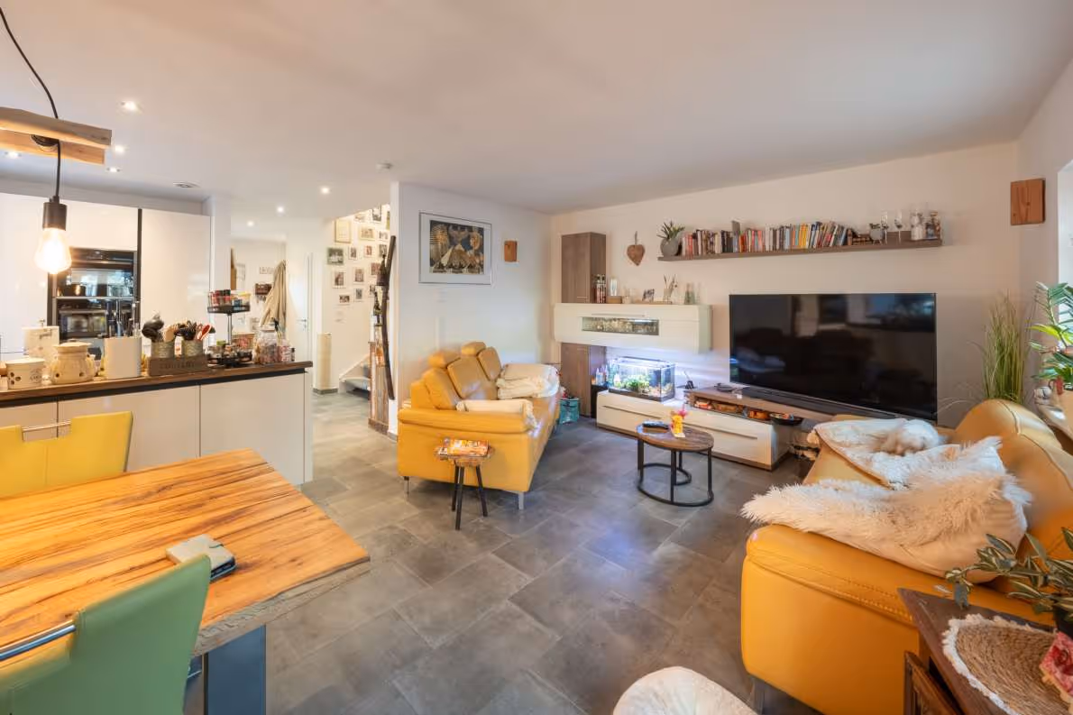 Im Erdgeschoss erwartet Sie ein großzügiger, offen gestalteter Wohn- und Essbereich mit direktem Zugang zur überdachten Terrasse und in den Garten, in dem sich zusätzlich eine praktische Gartenhütte befindet.