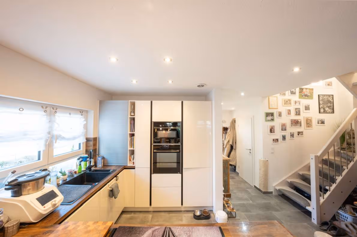 Angrenzend an den Wohnbereich befindet sich die offene Einbauküche, ausgestattet mit hochwertigen Elektrogeräten. Ein Gäste-WC, ein Abstellraum sowie ein Hauswirtschaftsraum runden diese Ebene ab.