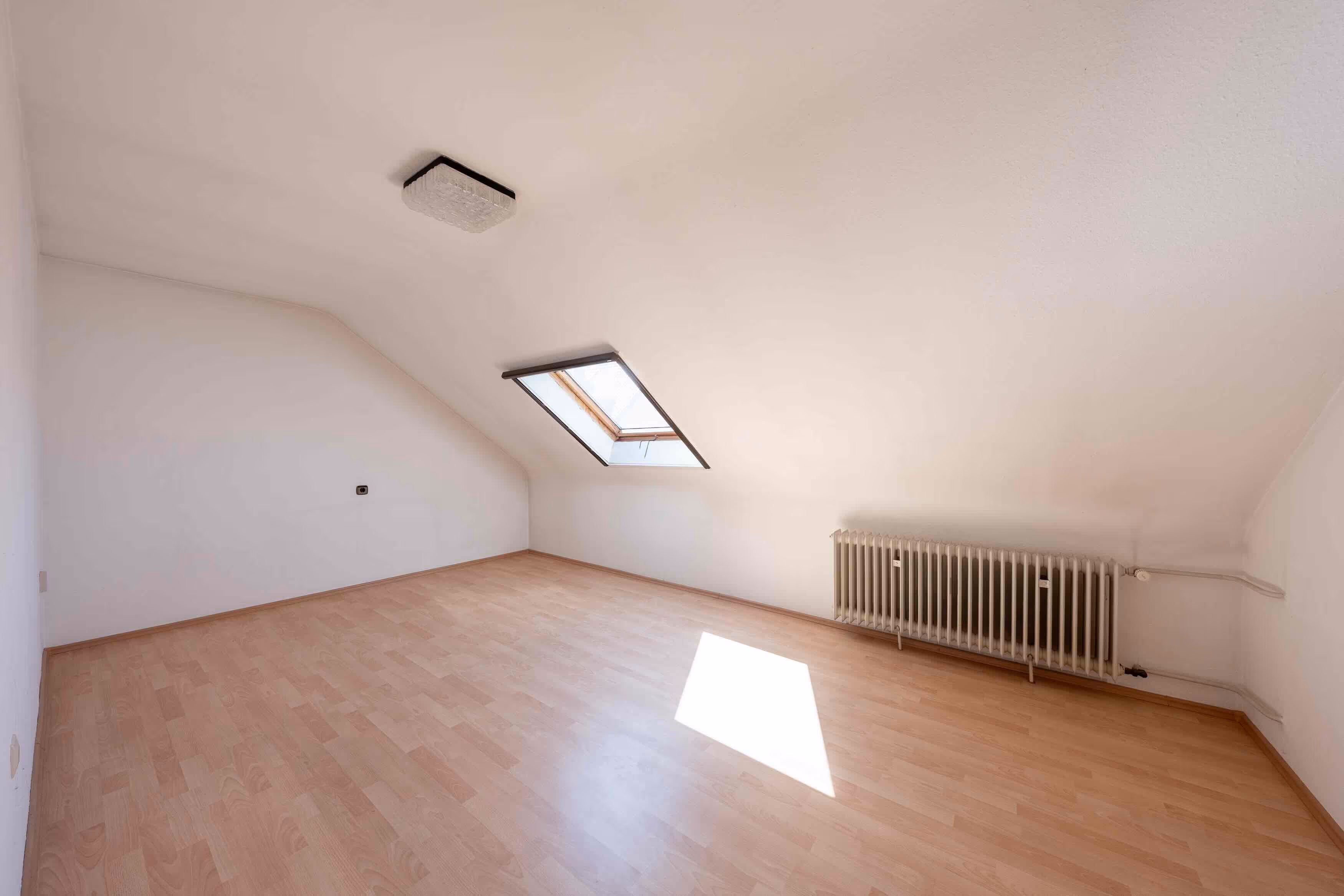 Über die Holztreppe gelangt man in die Dachgeschosswohnung, die mit ihrer Dachschräge eine geschmackvolle Atmosphäre von Gemütlichkeit und Einzigartigkeit vermittelt. Auf dieser Etage befinden sich zwei Schlafzimmer und ein Wohnzimmer. Die separate Küche mit Gaubenfenster schafft eine zusätzliche Stehhöhe und Kopffreiheit. Ein Tageslichtbad mit Badewanne, Waschbecken und Toilette rundet die Dachgeschosswohnung ab.