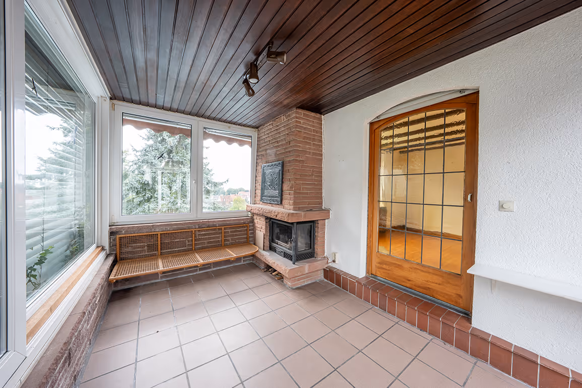 Das freistehende Einfamilienhaus ist voll unterkellert und verfügt über 3 Schlafzimmer, einen gemütlichen Wohn- und Essbereich sowie ein angrenzendes Arbeitszimmer mit offenem Kamin. Daran angrenzend findet sich der Wintergarten, mit einem traumhaften und unverbauten Blick in den eigenen Garten und auf die Weinheimer Burg Windeck. Eine Küche, ein Tageslichtbad mit Dusche und ein Gäste-WC komplettieren den Grundriss auf dieser Etage.